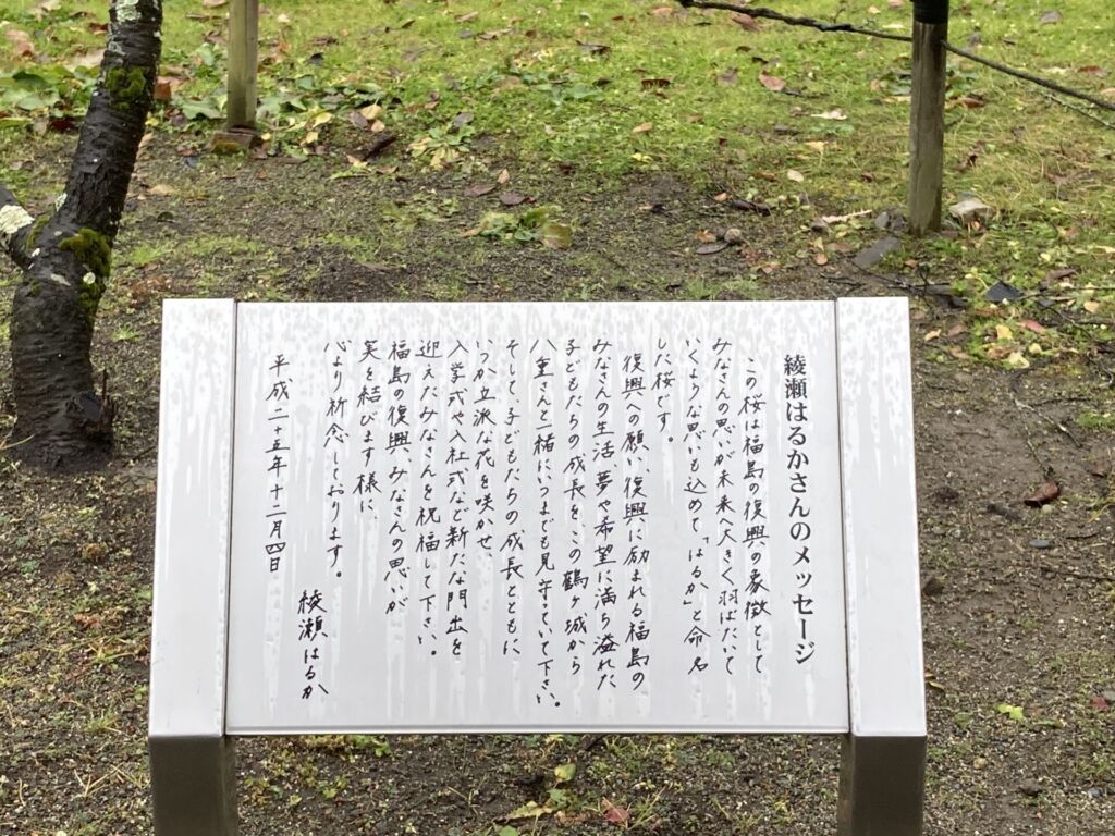 メッセージボードによると、この桜は福島の復興を願い、「はるか」と名付けられています。