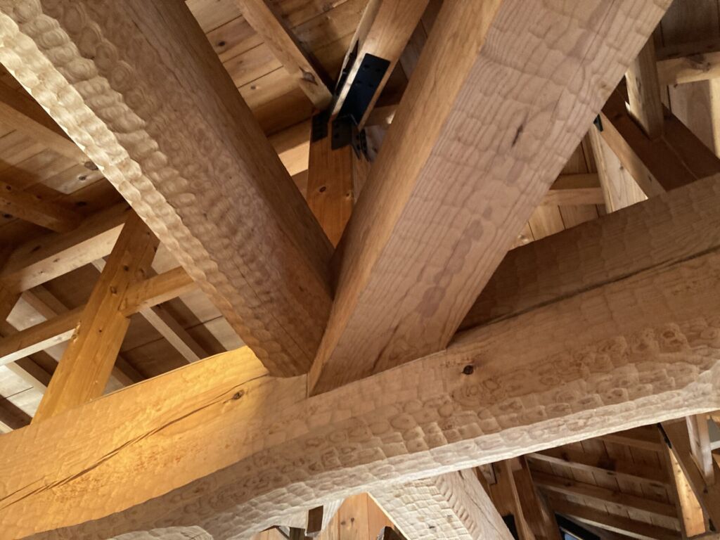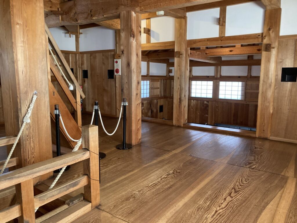 小峰城は江戸時代の絵図などをもとに復元し、梁にも当時の工法チョウナ(手斧)を使った仕上げが用いられています。