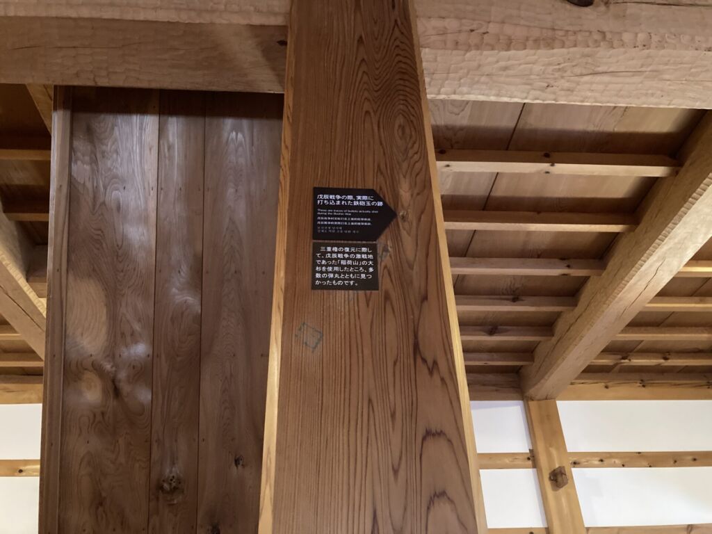 復元に使用された木材には、戊辰戦争の激戦地・稲荷山の大杉が含まれており、弾痕が残る材も確認できます。