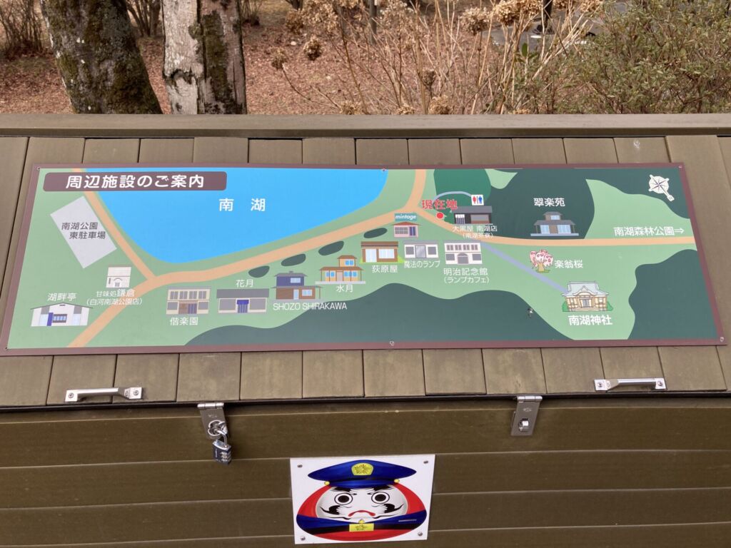 お店をまわってみると、南湖だんごを南湖だんボと記されている暖簾をみます。