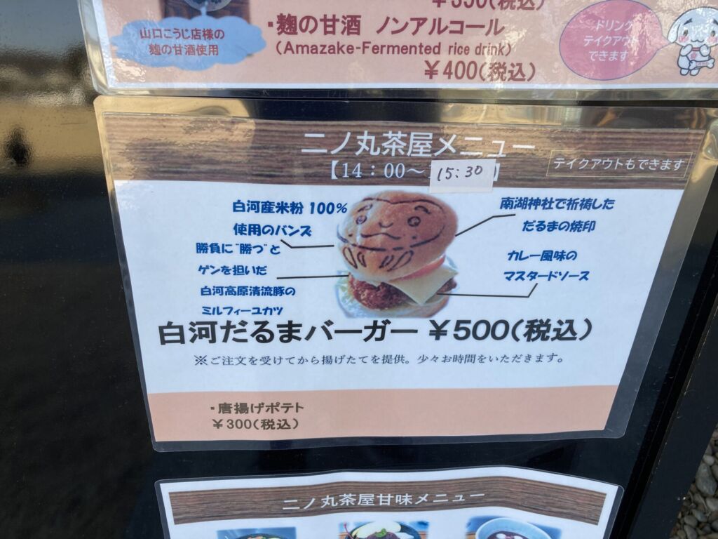 白河だるまバーガーのメニューをみると、けっこうなボリューム感なのに500円(税込)となかなかコスパがいいのでは。