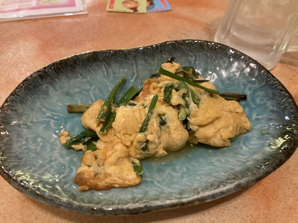 最初の1杯は残波黒の水割りを選び、おつまみにはスクランブルニラ玉を注文しました。