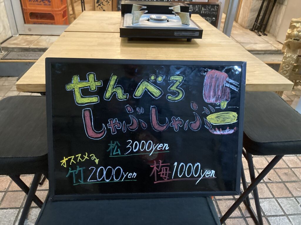 せんべろしゃぶしゃぶは松・竹・梅の3種類があり、価格はそれぞれ 3,000円・2,000円・1,000円。