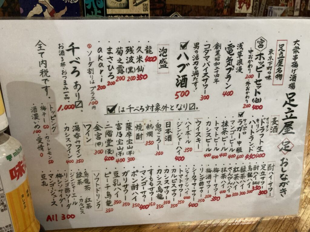 足立屋ではドリンク3杯とおつまみ1品で1,000円という、昔ながらのスタイルを今も続けています。