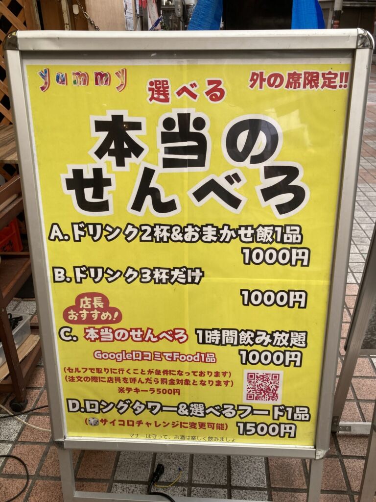 yummyのせんべろは「ドリンク2杯とおつまみ1品」、「ドリンク3杯だけ」、「1時間飲み放題」の3種類あり、いづれも1,000円。