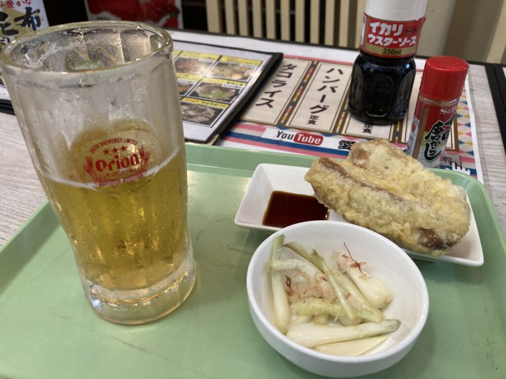 筆者は1杯目にビールを選び、おつまみはたこ焼きにしました。