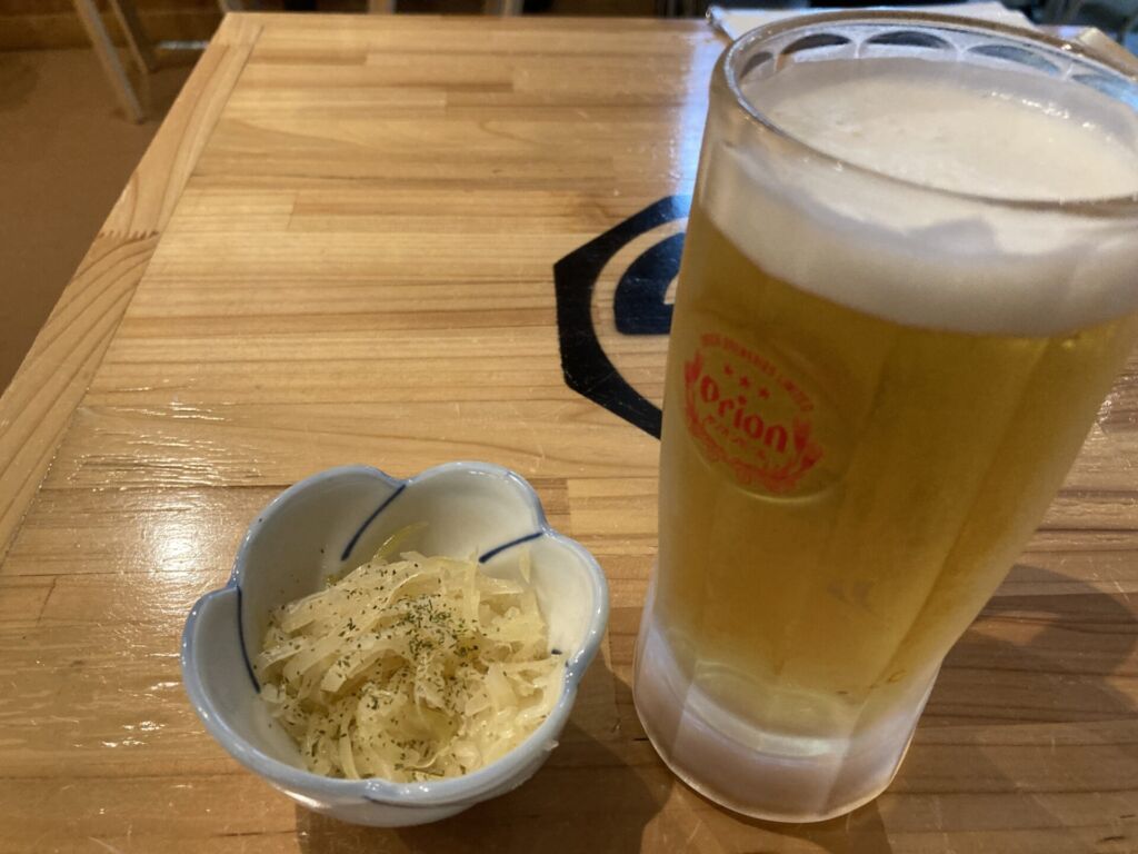 筆者は最初の1杯にオリオンビールを選び、おつまみは島らっきょとなすのはさみあげの2品を注文しました。