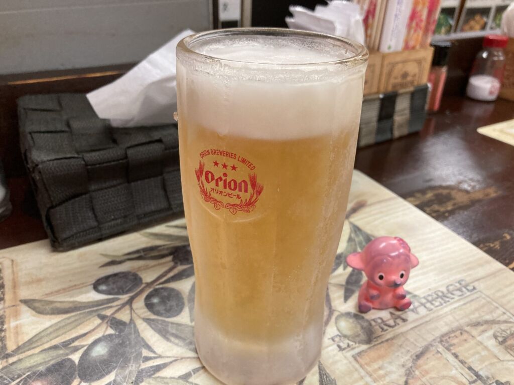 筆者は1杯目にオリオン生を選び、おまかせ1品にはパパイヤシリシリが提供され、沖縄らしい料理構成になりました。