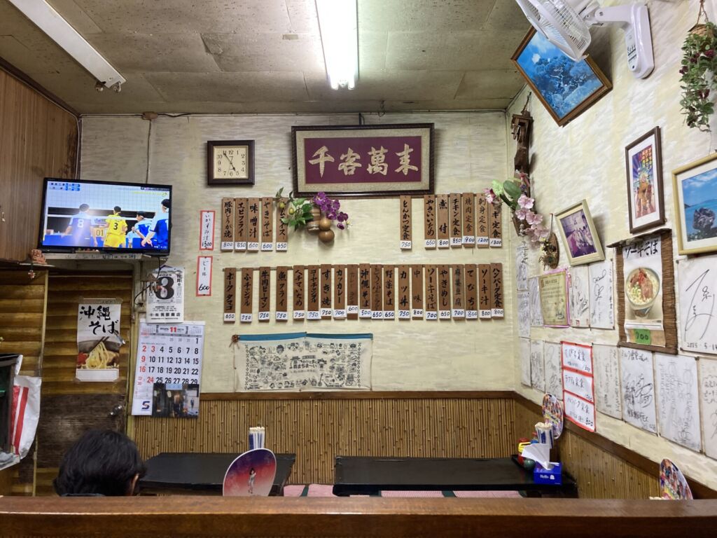 壁にはメニューの短冊が所狭しと並び、サイン色紙や額、そして「千客萬来」の額が飾られています。