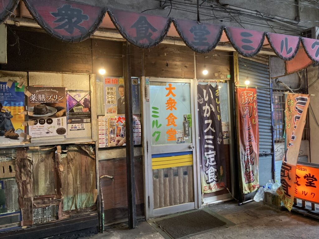 外観は、赤と黒の年季の入ったテント看板に「大衆食堂 ミルク」の文字が大きく掲げられており、その佇まいから昭和の食堂の歴史を感じさせます