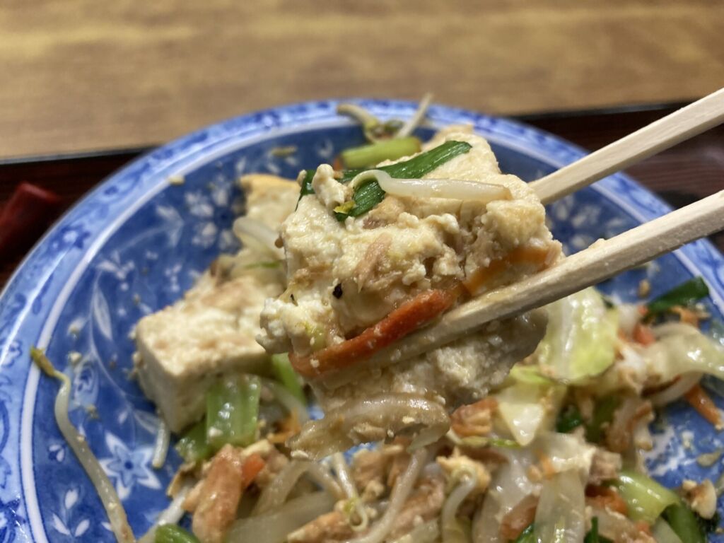 大きめに切られた島豆腐は、炒めても形が崩れず、口に入れるとしっとり。