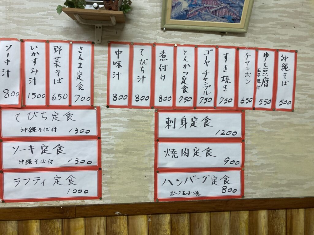 メニューの価格帯は、今回実食した「とうふチャンプルー」や「沖縄そば」の500円〜650円のゾーンが最も安く、定食類でも「ハンバーグ定食 800円」や「焼肉定食 900円」など、1,000円前後に収まるものが中心で、全般的に非常にリーズナブルです。