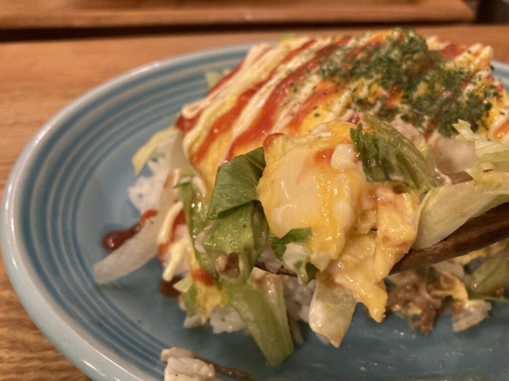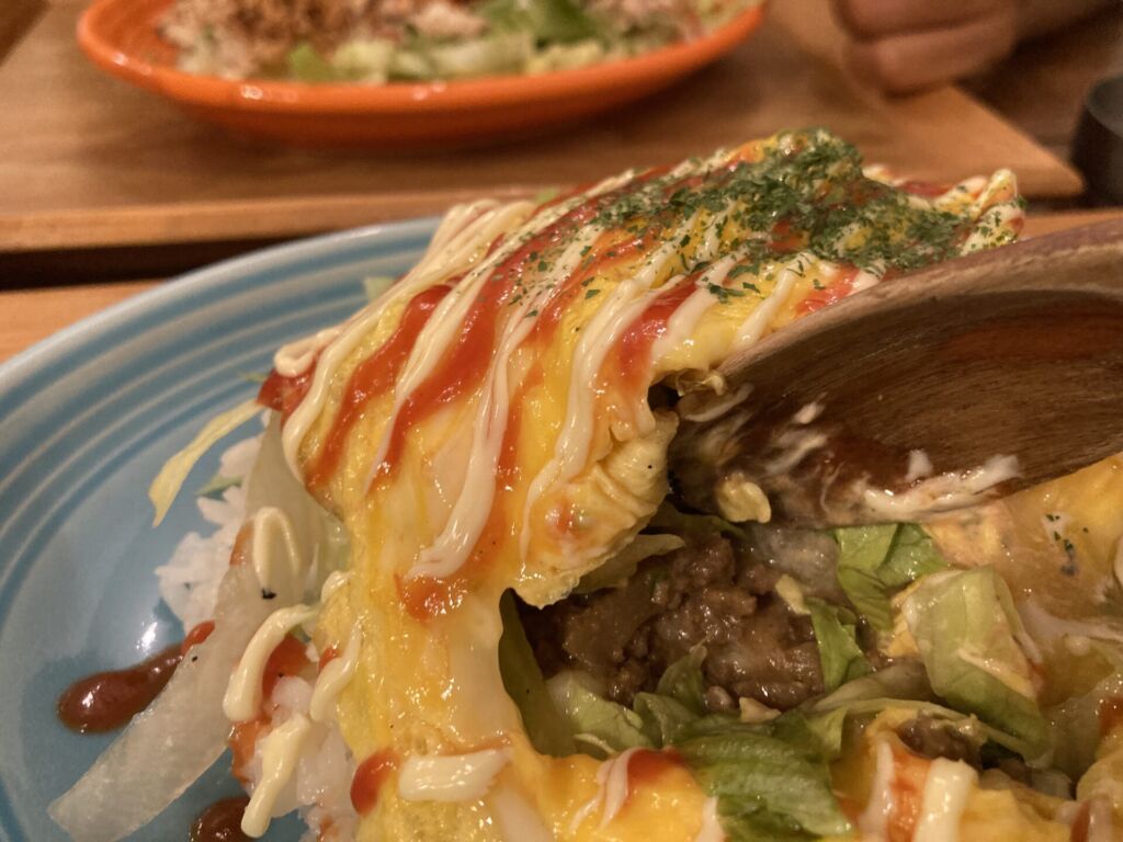 通常のタコライスが持つスパイシーな魅力に、オムライスのようなフワトロな玉子の優しさが加わり、非常に完成度が高い一皿です。