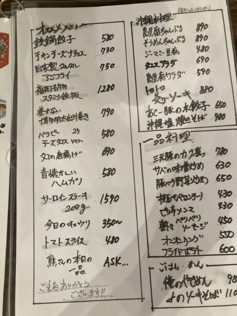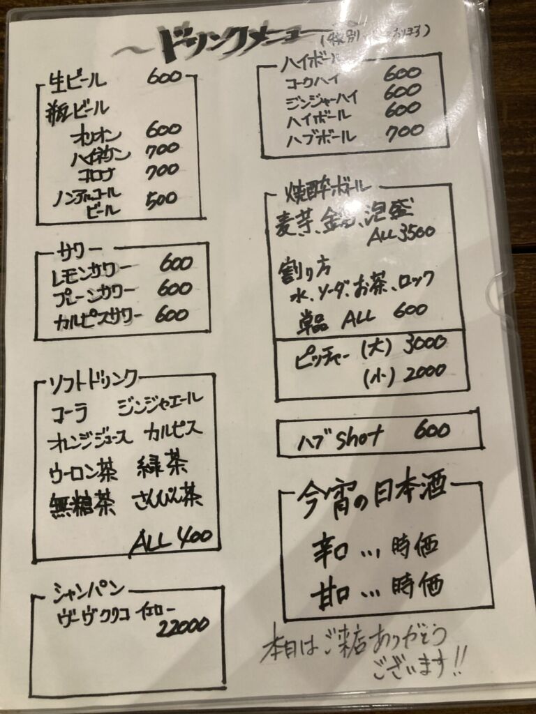 生ビールやハイボール、サワー類に加え、泡盛やハブ酒までそろっており、食事利用だけでなく軽い飲みにも使える一軒です。
