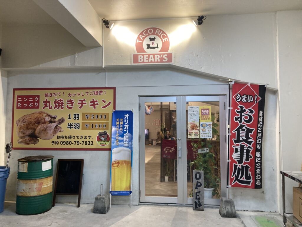 店の入口には「TACO RICE BEAR’S」と描かれた看板が掲げられ、隣には名物・丸焼きチキンの大きなポスター。