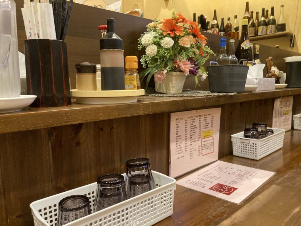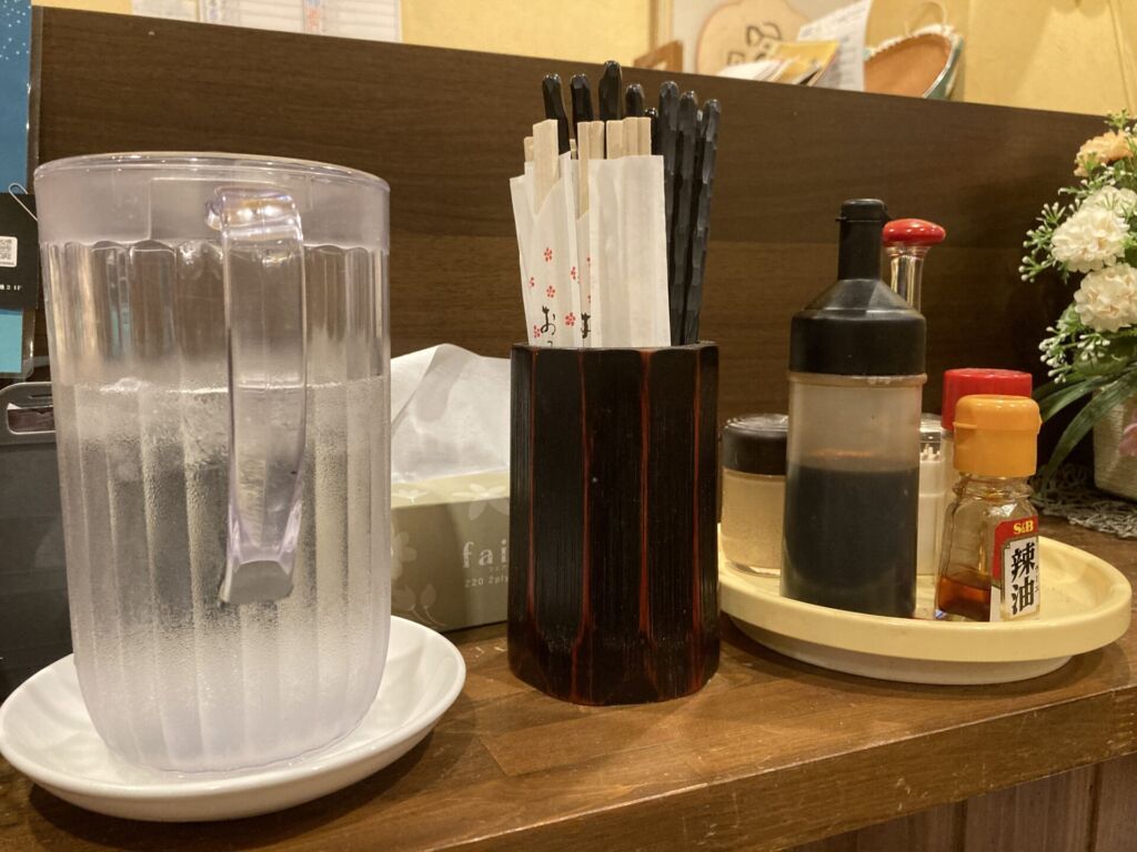卓上にはお冷やのピッチャー、箸、醬油、ラー油、七味、こしょう、爪楊枝とスタンダードな装備が並んでいます。