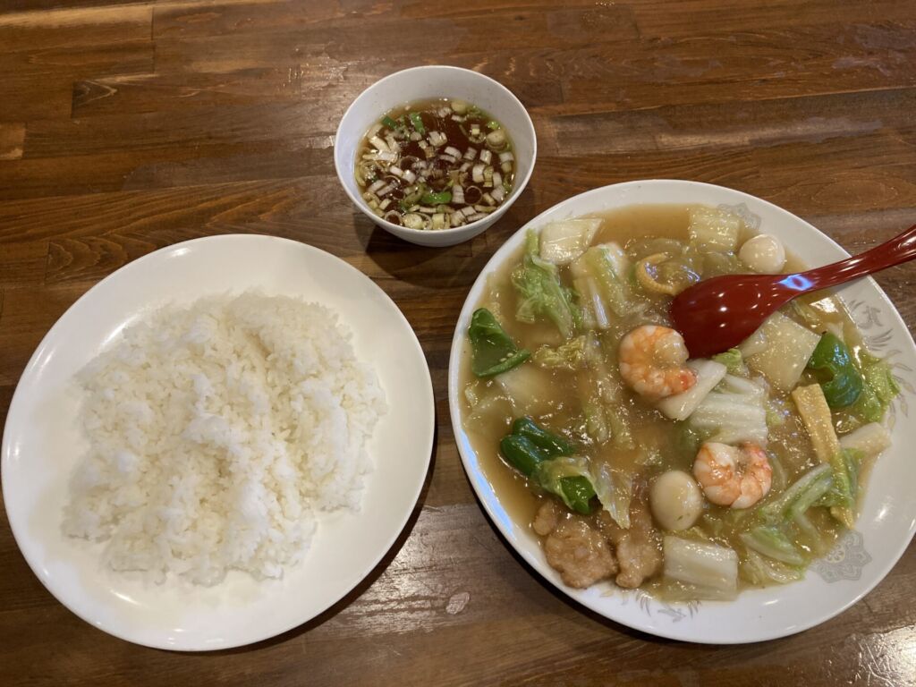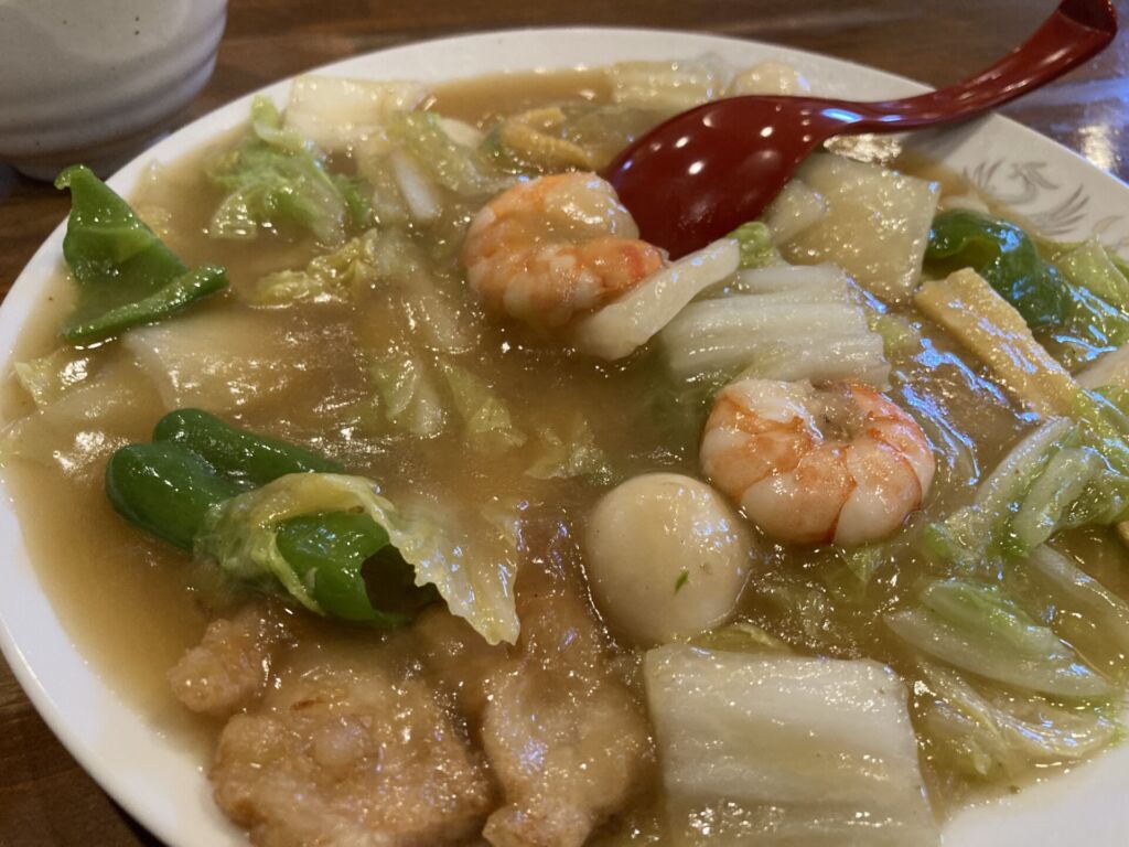 とろみのあるあんが具材を包み、野菜の甘みとえびのうまみが際立っています。