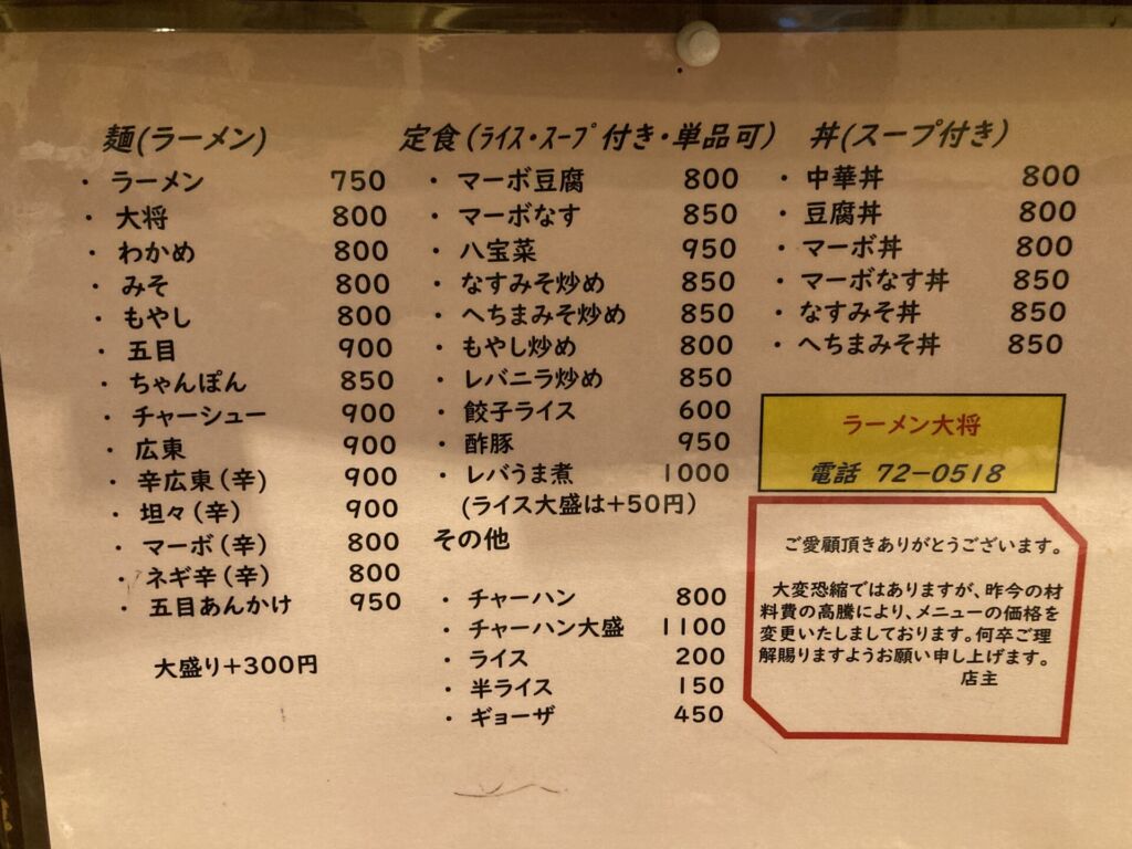 ラーメン大将のメニューは、名前の通りラーメン各種を中心に、チャーハンや焼きそばなどの麺飯類、レバニラ炒め・八宝菜・酢豚・麻婆ナスといった中華定番のおかず、定食メニューまで一通りそろっています。