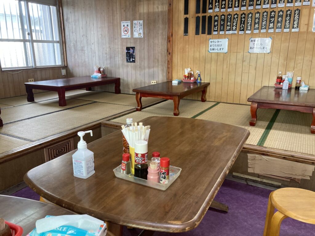 店内は木の壁と畳敷きの小上がり席が中心で、テーブル席も数卓あり。
