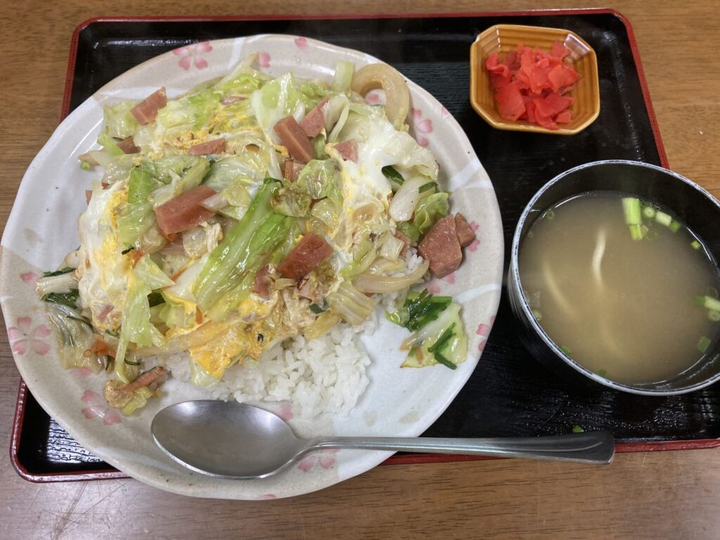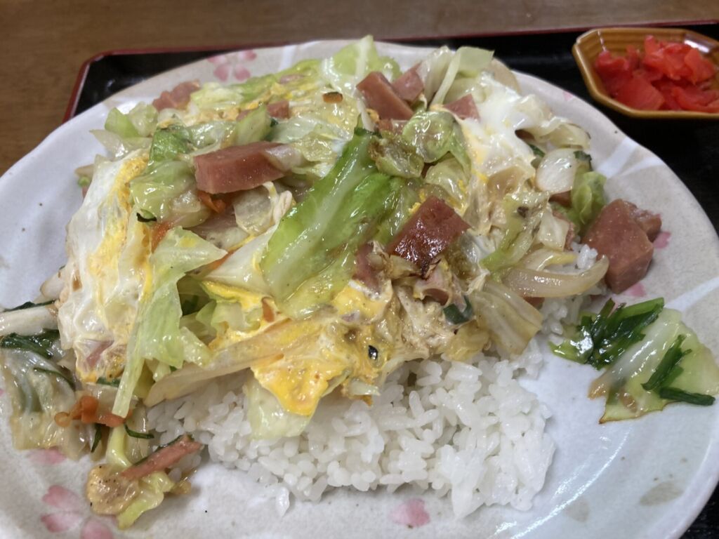 沖縄では、丼ごはんの上に野菜と卵をのせた“ごはんチャンポン”。