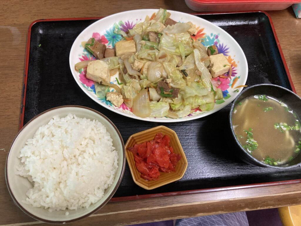 キャベツ、にんじん、玉ねぎ、島豆腐、ポークを炒めた一皿。