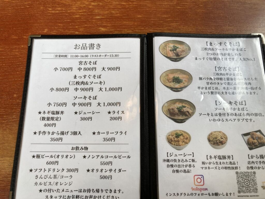 そばメニューは宮古そば、まっすぐそば、ソーキそばの3種類。