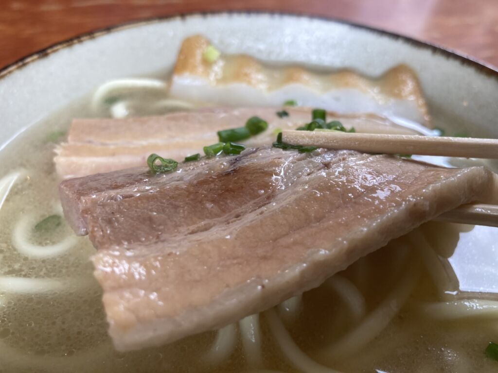 具材の三枚肉はやや厚めで、赤身と脂身のバランスが良く、口に入れるとほろりと崩れます。