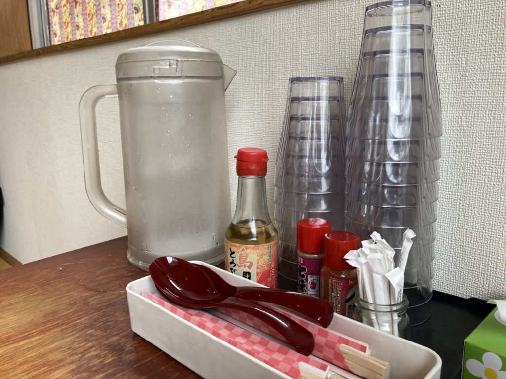 卓上にはピッチャーに入った冷たい水、透明なプラスチックコップ、島とうがらし、ティッシュ、お箸などが常備されており、セルフサービスで利用しやすいようになっています。