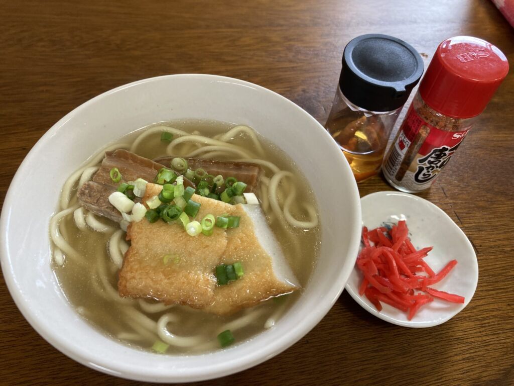 宮古そば、紅しょうが、コーレクース、七味唐辛子が運ばれてきました。