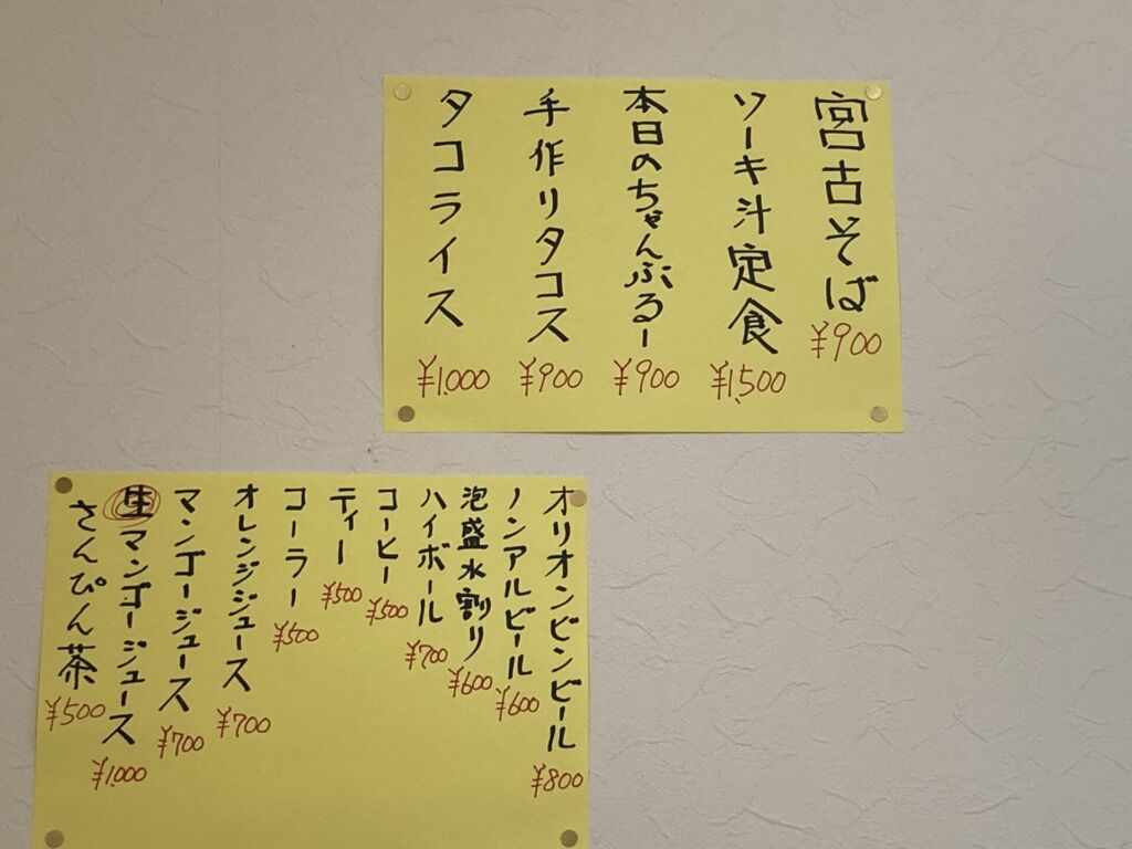 今回いただいた宮古そばの他、豚の骨付き肉を煮込んだソーキが主役のソーキ汁定食、沖縄料理の定番であるちゃんぷるー(日替わり)、そして人気メニューのタコライスと手作りタコスが並んでいます