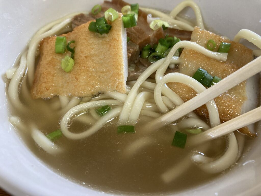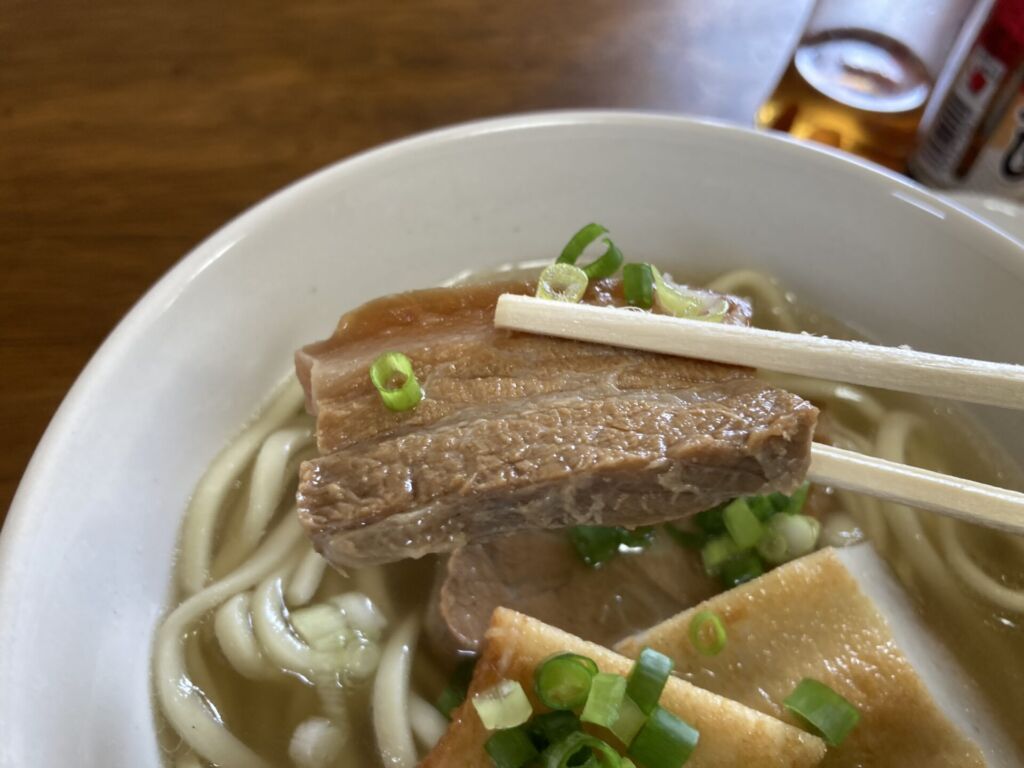 三枚肉はしっかりと煮込まれており、脂がやわらかく、甘辛い味つけがスープにほんのり溶けます。