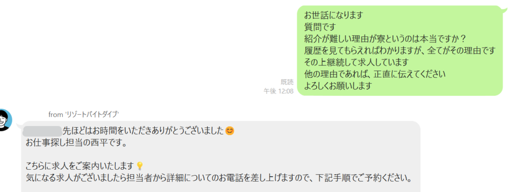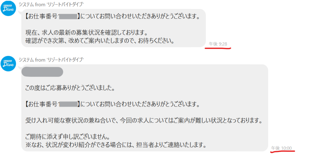 求人に問い合わせてから、おおよそ30〜60分ほどで「寮の兼ね合いにより今回は見送り」といった内容の返信が届く形になっていました。