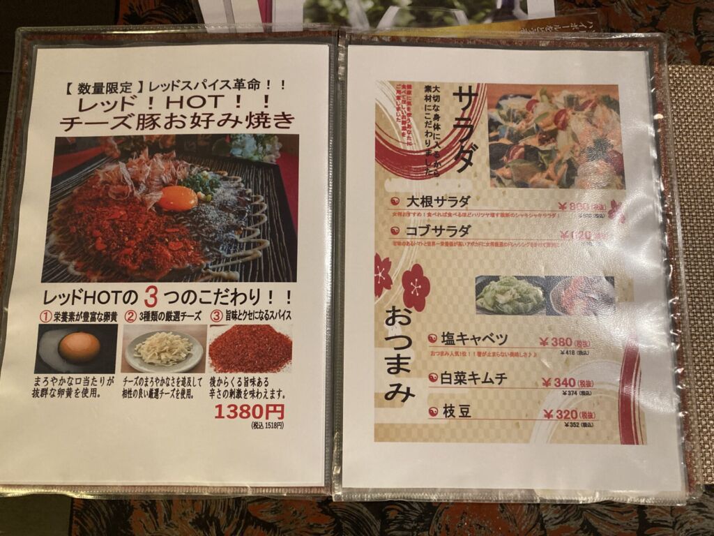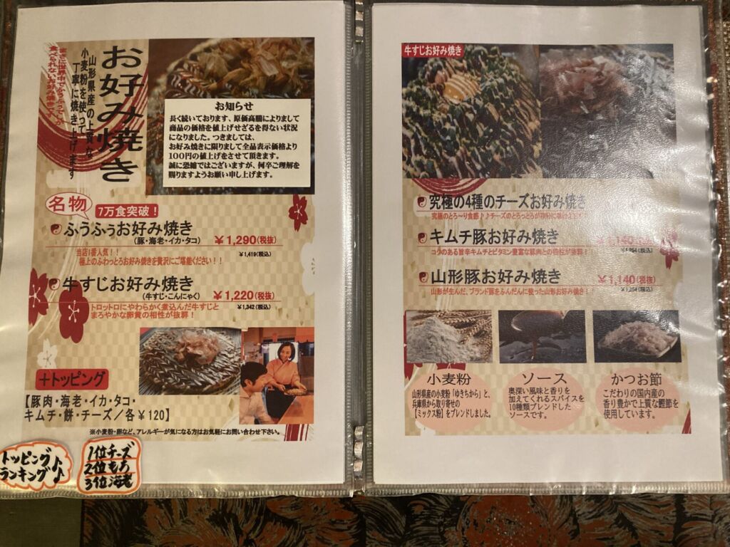 お好み焼きや餃子といった定番の鉄板料理に、地元山形の要素が加わったメニュー構成。