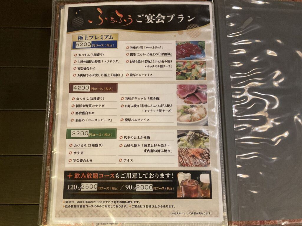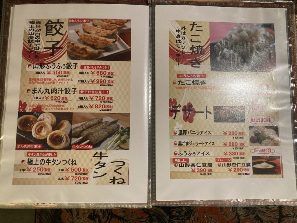 ふうふぅのメニューは、お好み焼きを中心に、餃子やたこ焼きといった粉物が並んでいます。