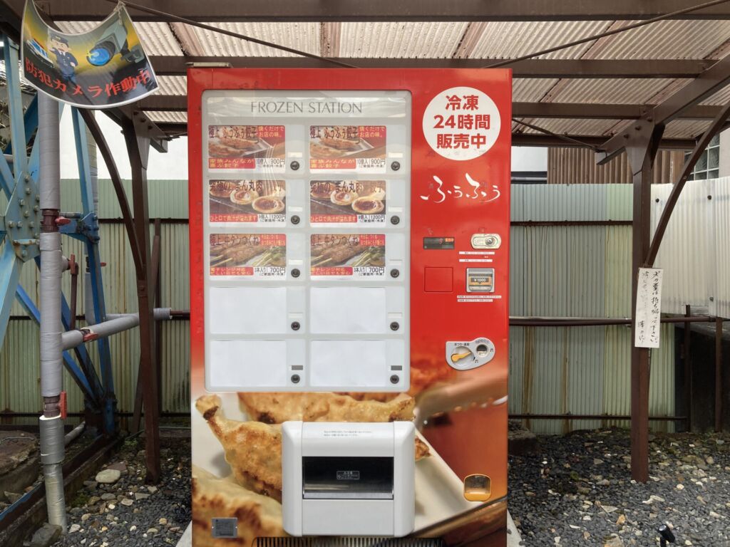 屋外には、ふうふぅ自慢の餃子やつくねの冷凍自販機も設置されており、持ち帰りにも対応しています。